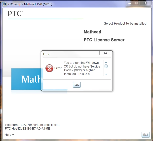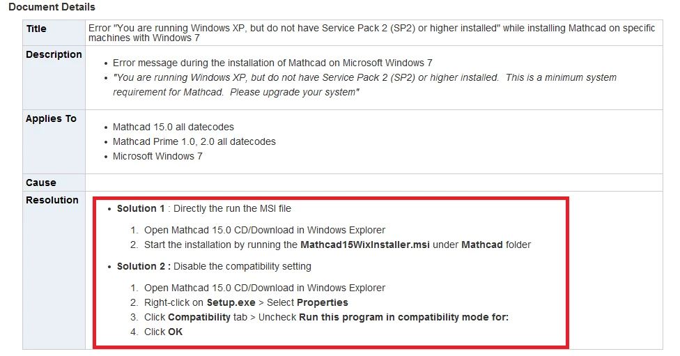 About a year ago I installed Mathcad 15 on my laptop and it gave me an error. "You are running Windows XP, but do not have Service Pack 2 (SP2) or higher installed. This is a minimum system requirement for Mathcad 15.0 M010. Please upgrade your system." At that time, this message seemed odd because I did not have Windows XP, but Windows 7. I called customer service, and they logged into my computer and fixed the problem. It worked as expected. I do not know what they did.