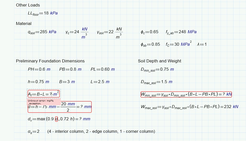 I have been having problem with Mathcad Prime 3.1 crashing lately. First, when I load my files, some random equations will be red-circled as "Unknown Error: mpl%_Exception". (see attached image). As soon as I start changing the values on my worksheet, Mathcad would crash.