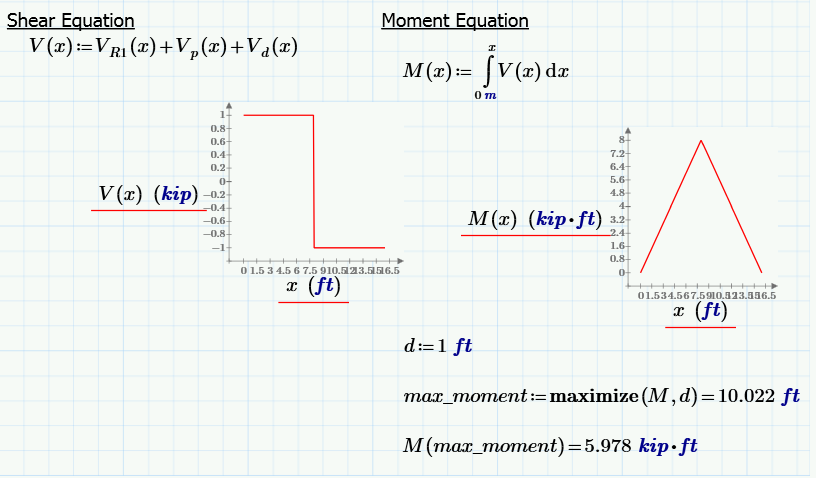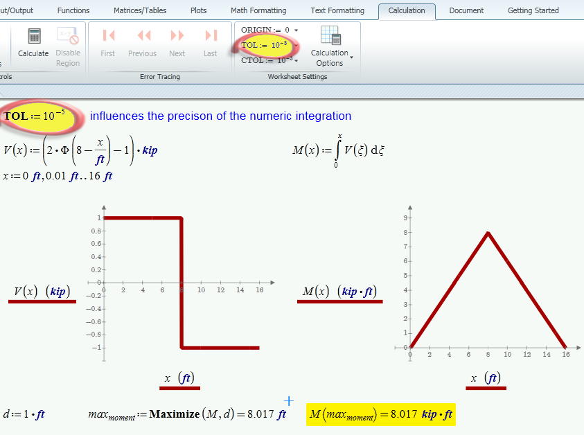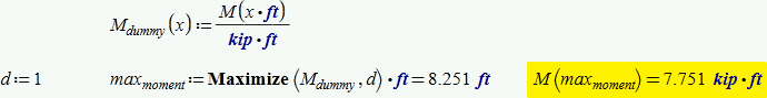 Werner: Thank you, I’m not sure how changing the TOL value makes the maximize function successful; values from 10^-5~-15 were not successful in my sheet. If a worksheet contains many integrations maybe the TOL will have to be adjusted for each. Creating the unitless dummy function seems to make the maximize function work. The graphs of shear and moment will get much more complicated with many local mins and maxs, I’m hoping this is the answer.