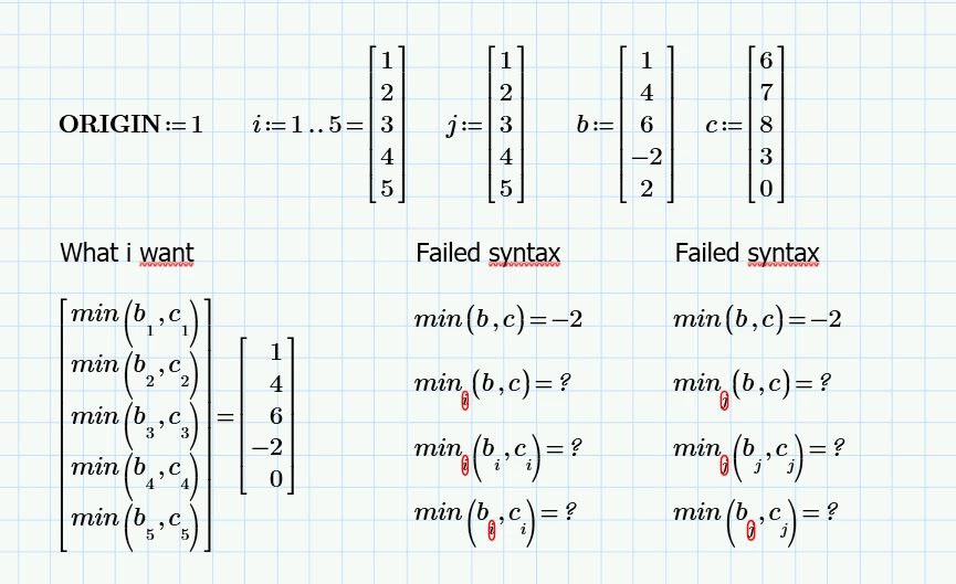 The min/max function finds the smallest/largest value across both matricies at every index, which is not what i want.. PNG and mathcadfile attached for clarity. I am using mathcad prime 9.0.0.0. I have tried several syntaxes (shown in the attachment), but to no luck.