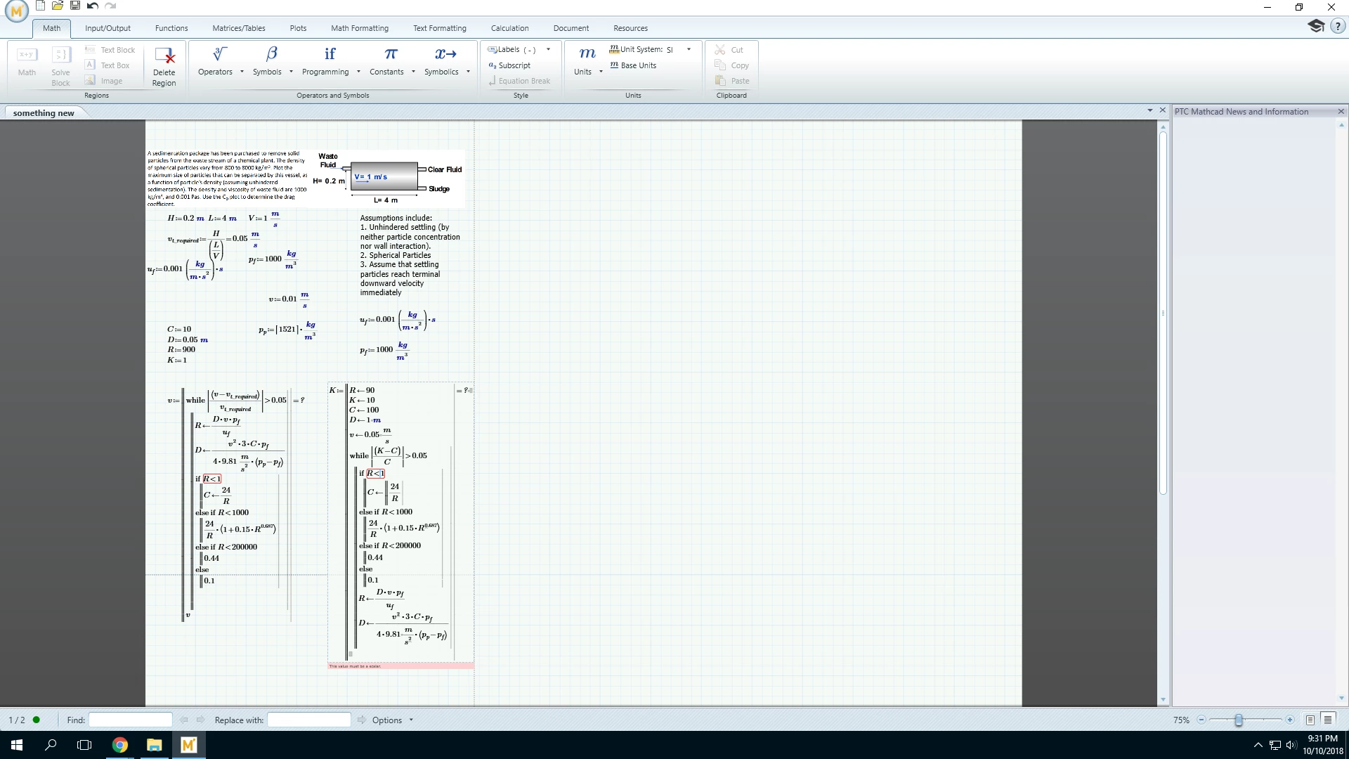 Hi, I am trying to do this workshop as shown in the attached picture. I am a new user to MathCAD and it needs to be done using MathCAD. It is an iterative calculation to find parameters related to the terminal velocity in a settling equation. In this case, the desired terminal velocity of the particle is known, I am trying to find what the associated diameter D for that velocity would be, given a certain particle density p_subp. Reynolds number is R, Drag coefficient is C, as defined by the equations in the picture. you can rearrange the velocity equation in terms of v or D as desired. The physics part is easy but I am having the following issues.