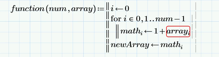 • You introduce two new arrays in your function, math and newArray. Thats inefficient and not necessary. Unless you have to reuse "older" array values for your calculations you can use the argument for the new values as well. This does not change anything in the array you provide as function argument. The function is playing with its own local copy. A program in Mathcad can't change any worksheet variable from within the program.