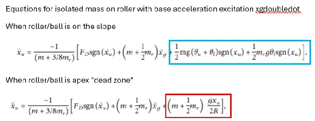 Hi, I am trying to solve an ODE to model a “Ball and Cone” tuned mass damper. The equations simulate a ball mounted inside a pair of cones with mass on top. The ball oscillates up and down an inclined slope with a curved region at the apex between the up/down slopes. I am using Radau solver as it is a stiff equation. Adams/BDF “does not converge”. The 1st solve block uses a simplified simulation for base excitation of the TMD. Using Radau with modest levels of damping the first solve block result gives a discontinuous response which should not happen given the inclined slope is a tangent to the curved section at the apex. Any ideas how I can correct this discontinuity would be appreciated.