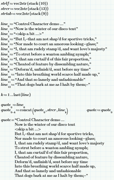 Whilst playing around with Prime, I noticed that some non-displayable characters seem to have the effect that one would normally expect in a string; for example, char(9), char(10) and char(13) act like tab, line-feed and carriage-return. Here's an example (using Prime Express, hence the strange manner of its execution).