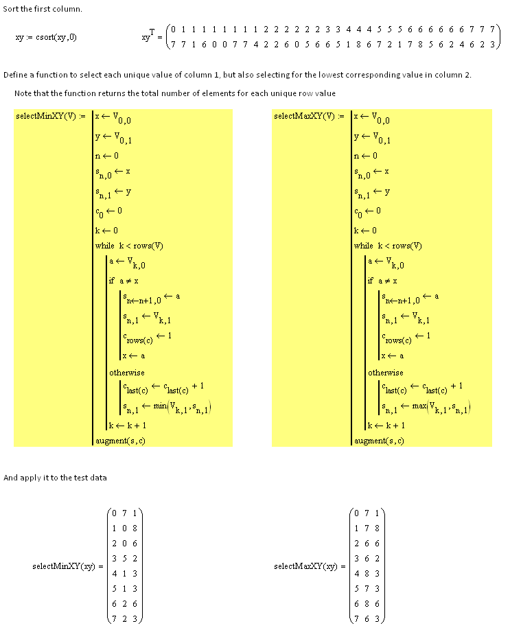 I have a matrix with two columns. The first column is sorted and there are repeating elements in the first column with the corresponding elements in the second column.