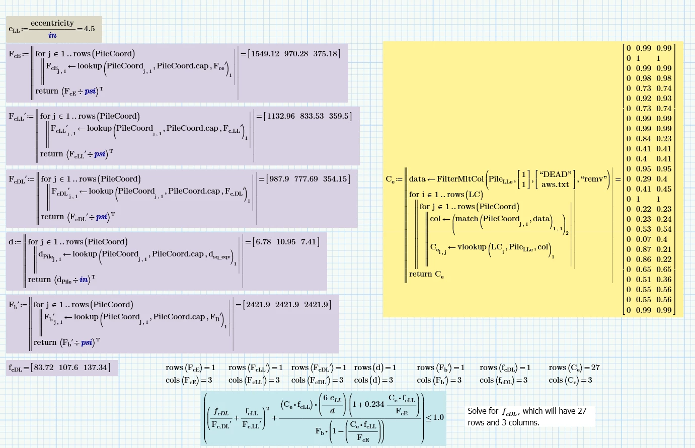 I am attempting to set up a sheet to calculate the allowable stress due to live load for 27 different vehicles. I have an equation (see screenshot) where all variables except one have been defined into matrices. I need to figure out a way to iteratively solve for fcLL for each of the 27 different loads given the other defined inputs. I've tried using a solve block and I've tried using root() but I haven't quite figured out how to use these to solve for a system of matrices. The number of rows for each matrix is static and won't likely change, but the number of columns is dynamic based on earlier inputs. For this example, I have three columns of data.