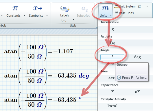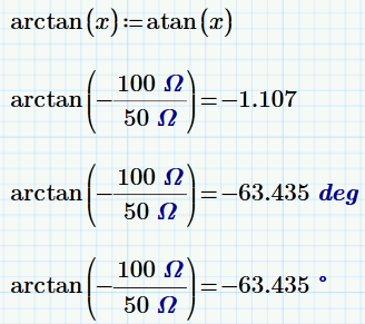 I have a problem in mathcad I do this problem -(100ohms/50ohms)tan^-1= Now when I try to add a degree sign at the end it errors out. I have done this problem and know it works however when trying to do it again this happens. I noticed the only difference between the one that works (formula) and the one that doesn't there is a shaded out box before the degree sign (one that doesn't work) I have tried to delete it no go. Any suggestions?