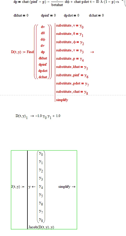 I am trying to solve a system of ode's that have gotten increasingly complex as I have added various effects. Everything was working ok until I made the last change (in attached worksheet, addition of the last term - in parentheses - in the expression for dp in the solve block). Now the worksheet does not even get past the solve block to the ode's. I dont get an error message. It just keeps calculating although I have left it for 30 minutes or so. The addition does not seem that complicated: the system is still linear for dv, etc.