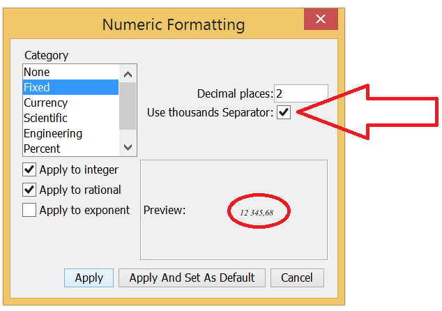 This seems so weird that this isn't an option in a long-developed program created around doing math on a computer in a more legible way like we do by hand... Surely it isn't that hard to format numbers like that? Spreadsheets have been doing that for decades, as far as I can remember. It might take several options to account for differences in local custom, like using a point for a decimal point and a comma for the thousands separator here in the US versus a comma for the decimal and a space for the thousands separator in other regions, but still.... If Microsoft can figure it out, surely Mathsoft - I mean, PTC - can figure it out. And this request is from 9 years ago and still nothing.
