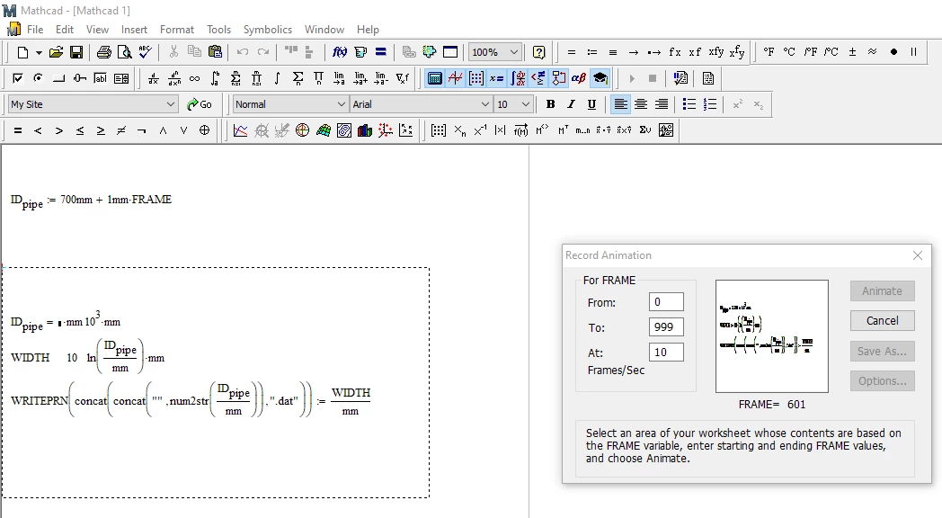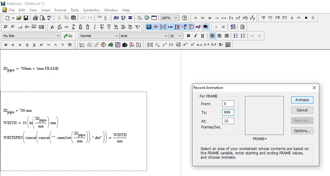 Is there a way to modify the contents inside WRITEPRN to make Mathcad store all results in one text file containing two columns (IDpipe & WIDTH), where number of rows with data corresponds to the number of FRAMES used to record that animation?