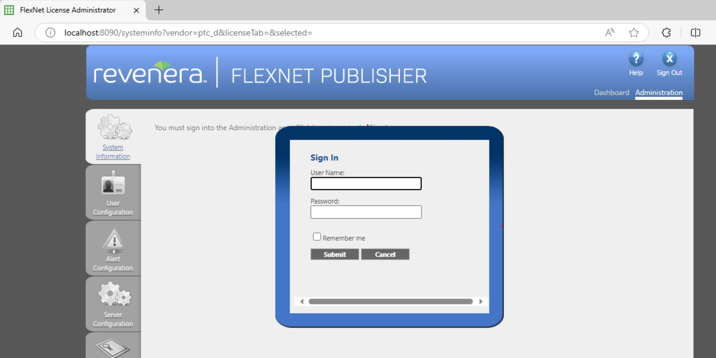 Also when I go to the Administrator section of the FLEXnet Admin tool it is asking for a administrator login, however I'm not sure what login information to use because it is not accepting my PTC login information or my server administrator login, so I'm not sure why this is not working.