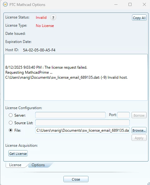 "Mathcad Prime reports an error "(-9) Invalid host" on specific machines even though host-id in the license file matches with host-id displayed in application UI": https://www.ptc.com/en/support/article/CS314914