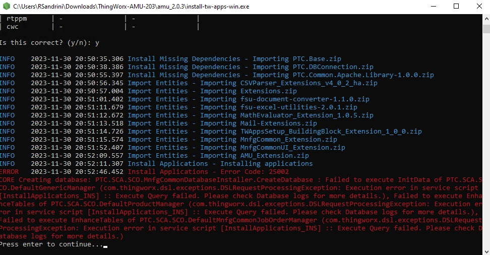 CORE Creating database: PTC.SCA.SCO.MnfgCommonDatabaseInstaller.CreateDatabase : Failed to execute InitData of PTC.SCA.SCO.DefaultGenericManager (com.thingworx.dsl.exceptions.DSLRequestProcessingException: Execution error in service script [InstallApplications_INS] :: Execute Query failed. Please check Database logs for more details.), Failed to execute EnhanceTables of PTC.SCA.SCO.DefaultProductManager (com.thingworx.dsl.exceptions.DSLRequestProcessingException: Execution error in service script [InstallApplications_INS] :: Execute Query failed. Please check Database logs for more details.), Failed to execute EnhanceTables of PTC.SCA.SCO.DefaultMnfgCommonJobOrderManager (com.thingworx.dsl.exceptions.DSLRequestProcessingException: Execution error in service script [InstallApplications_INS] :: Execute Query failed. Please check Database logs for more details.)