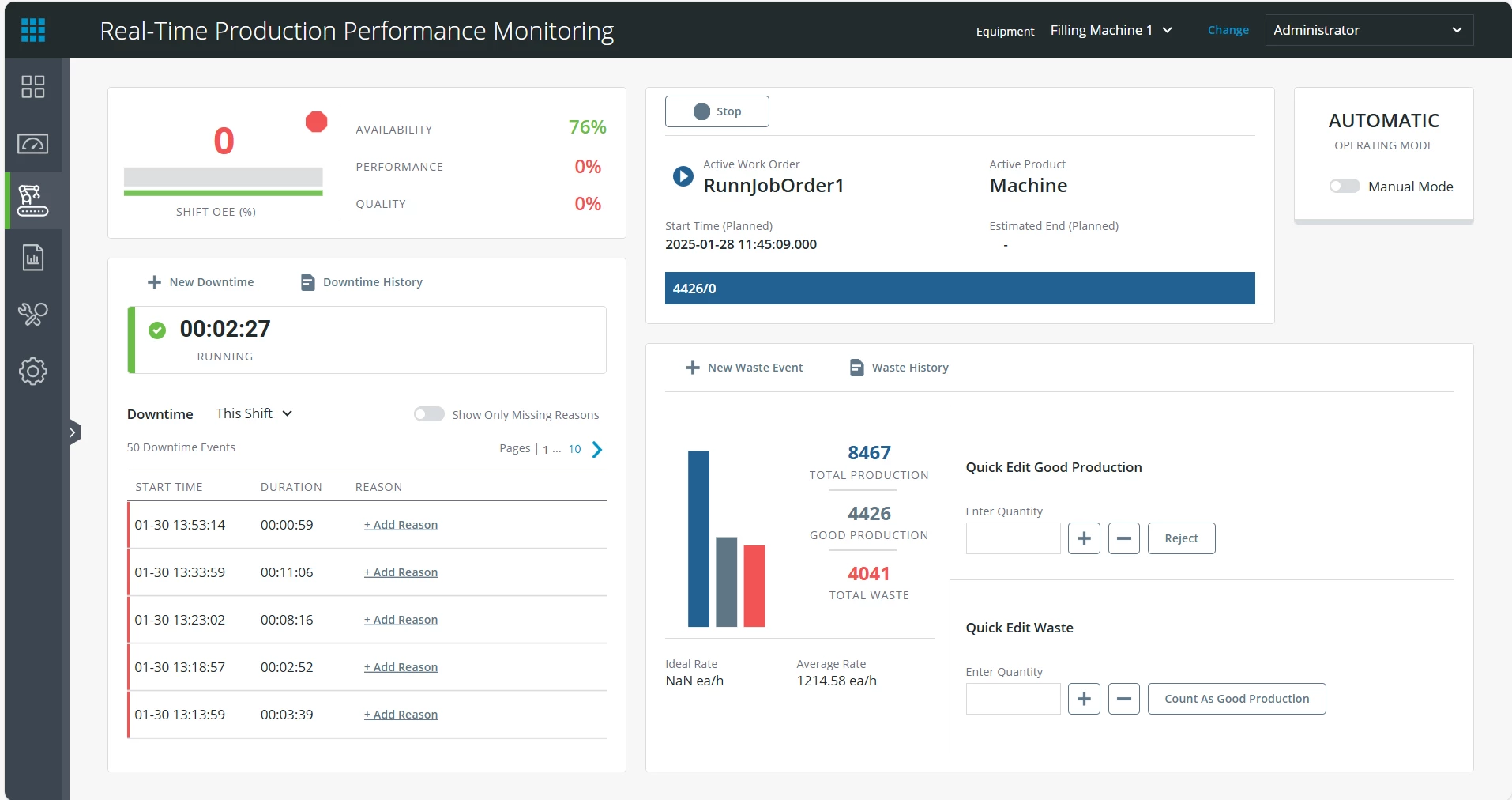 I can see an issue in your screenshot is under your quantities, the Ideal Rate is empty (NAN). This is most likely the problem for Performance, as it's the difference between Ideal Production and Total Production (as seen in the OEE popup). In order to have ideal production, you must set the nominal value of a limit that fits the current run (equipment = Filling Machine 1, Product Type = ..., Product = Machine). To enter limits, go in the Configuration -> Characteristics screen, make sure in the Characteristics tab you have one with the Ideal Production type and the correct UOM (such as kg), and then in the Limits tab you can download the template, fill it, and click on Import to add it in the database.