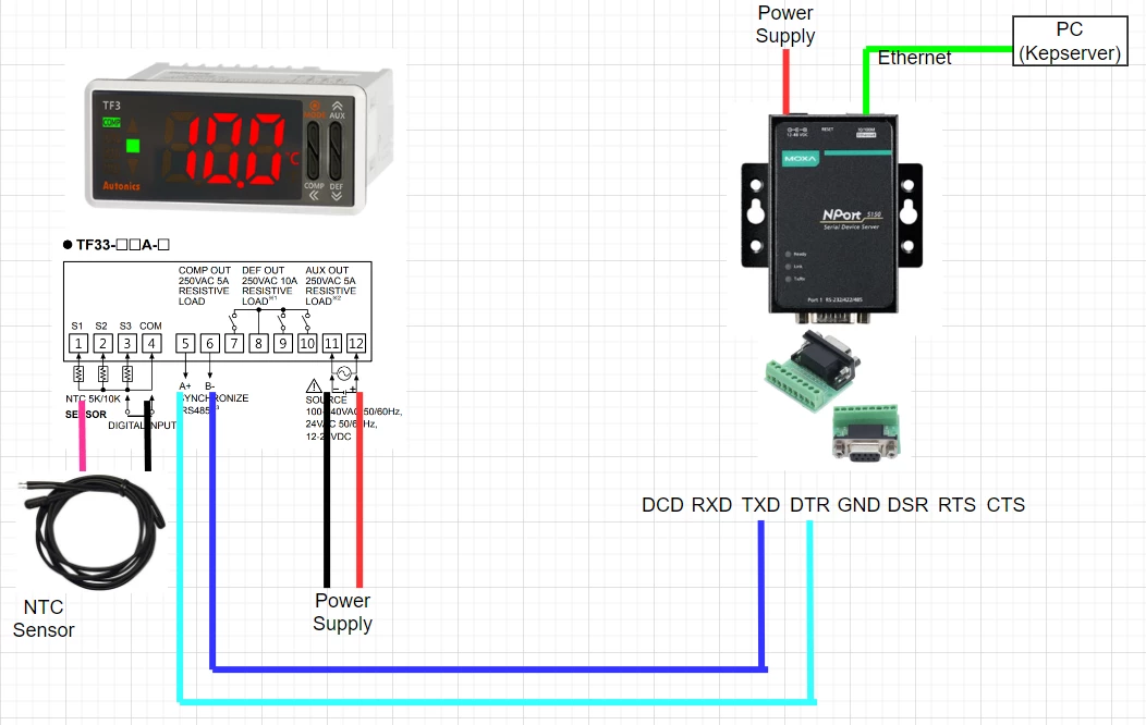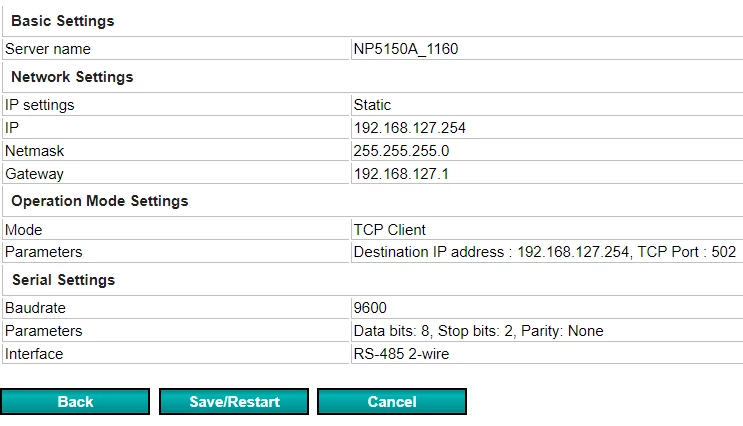 I have an application where Kepserver EX6 is used to read the present value of a temperature controller (Autonics TF33) which has RS-485 connection. Moxa NPort 5150A acts as gateway for the device to the Kepserver. The diagram of devices are attached. Currently, I have good quality of connection to the modbus address of the device, but reading is 0. Furthermore, in order to get clear picture, inside the NPort Web Console, I set the IP Address to its default (192.168.127.254) and operation mode set to TCP (Device is TCP Client) where destination IP address is the NPort IP Address. Details are attached also. Then, inside the Kepserver, I assign channel as Modbus TCP/IP ethernet with port number as same as written in Moxa (i.e. 502). Then, the modbus address I took from the manual of the device (attached).
