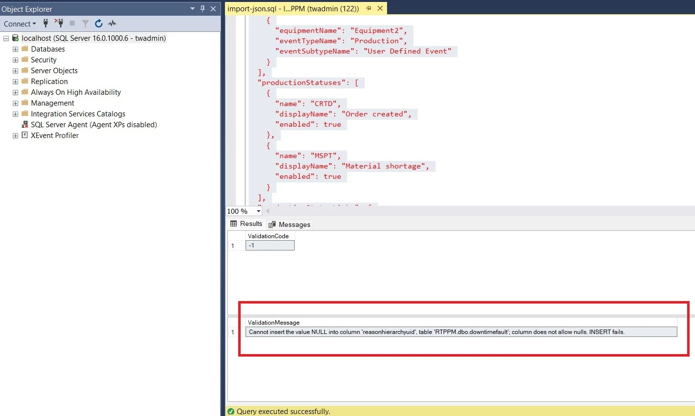 Cannot insert the value NULL into column 'reasonhierarchyuid', table 'RTPPM.dbo.downtimefault': column does not allow nulls. INSERT fails.