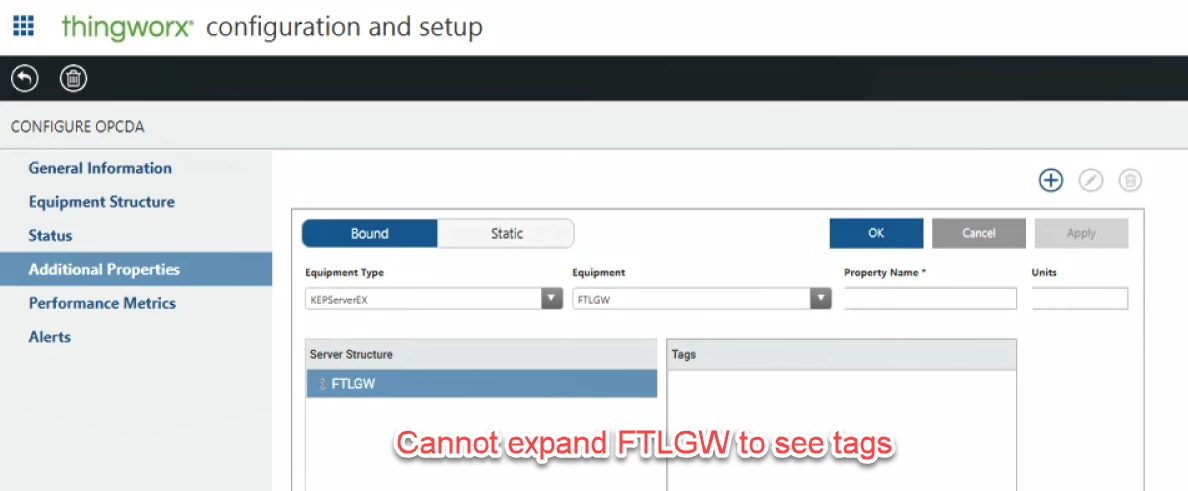 Within the Thingworx Composer I can browse all tags normally via any Mange Bindings screen. However, when I try to browse for tags in either the Trends & Troubleshooting or Configuration & Setup, I cannot expand past the top level.
