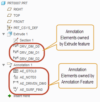 Annotation elements, by contrast, are owned by another feature in the model. Typically this feature is an annotation feature, but it can also be general modeling feature (such as Extrude or Hole).