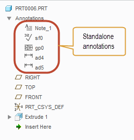 • Standalone annotations appear in the model tree under the Annotations node at the top. They are presented in a flat list grouped by type. If the model contains a large number of annotations, it might become a little hard to manage such a long list of annotations in Creo 4.0. Using annotation features would allow you to group and structure the annotations in the tree.