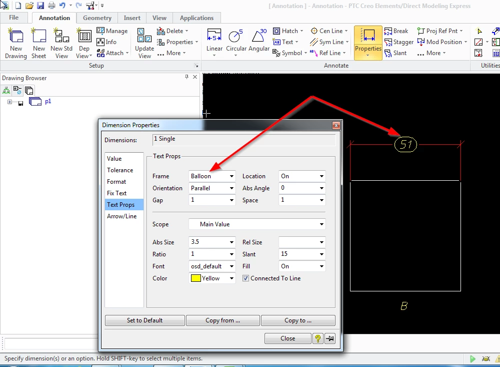 I would like to know whether the balloon frame which is shown as a closed circular frame is used for the reference dimensions in creo element direct modelling because in standard practice the frame for the reference dimension is of open circular brackets.
