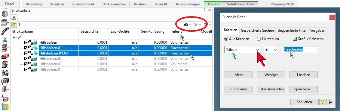 Is there a way to search for face parts in the structure browser? I would like to isolate all face parts so they can be repaired after import.