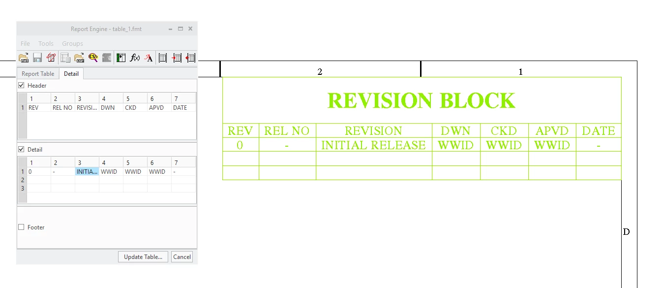 Is it possible to wrap text or fix the cell size in a report engine? I am trying to create a revision block for a drawing utilizing the report engine. The user would just have to alter the presets to apply their information. The picture attached shows what I am intending on doing. Currently, we have to adjust the cells and remove borders in order for it to appear correct.