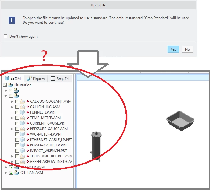 I created a Creo Illustrate file and embedded all CAD models (none were linked). Recently I opened the .c3di file, and saw the pop up message: "To open the file it must be updated to use a standard. The default standard 'Creo Standard' will be used. Do you want to continue?" I clicked "yes" and then opened the file. Half of the CAD odels were unchecked and missing - in the sBOM (and the eBOM) they were unchecked & had red "X"'s by them. I have attached a screen-clip. Does anyone have any idea what happened?
