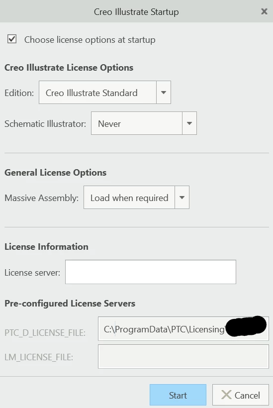 when i am launching Creo Illustrate 8.1 the startup menu appears as normal. But when i click start nothing happens (Window gets closed). However, if i use an server with the license, it works fine.