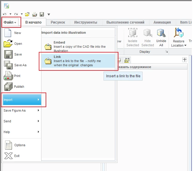 "Link" option in Creo Illustrate 1.0 M030 ("File" -> "Import" -> "Link"):