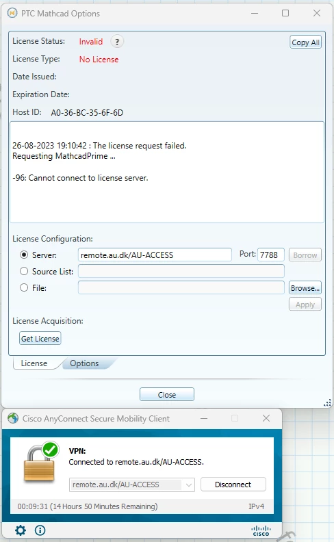 Im a student at a University. Our Mathcad license is network(IP?) based, which means i need to be on a VPN given to me by my university. However while being on the VPN and following every step in the installation guide it doesnt seem to work. I've even checked my IP while being on the VPN to make sure there wasn't any problems with it. Ive attached a picture of the VPN and the license status. I hope someone can help me with this.