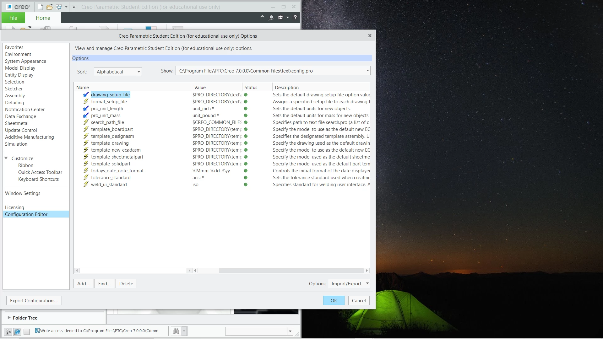 config.pro file mentioned on the picture is default Creo configuration file. I do not know how did you modify its options and where did you save modified file.