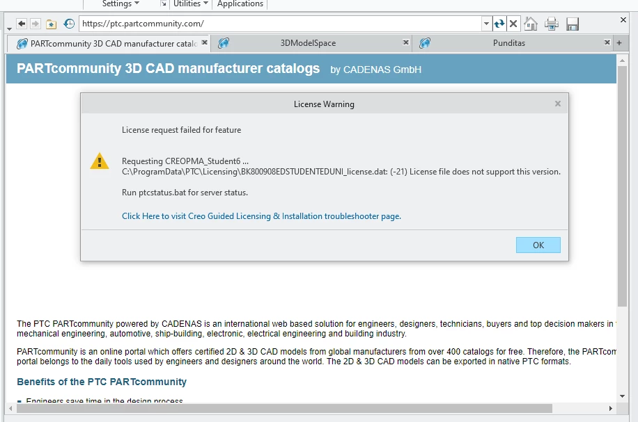 Hello, Creo seems to have problems accepting the license. I have done digging here already and found the code BE110908EDSTUDENTEDK12. This has not worked and give the incorrect file type or location error. Not sure what the problem is so any help works.