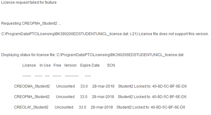 For some reason when I go to enter the license code it always fails. I even tried using the relicense instructions and it still fails. When I went to open Creo it gave me an error which I have taken a snapshot of and attached. This is the current code that I am using- BK400407EDSTUDENTUNICL. Thank you for your help.