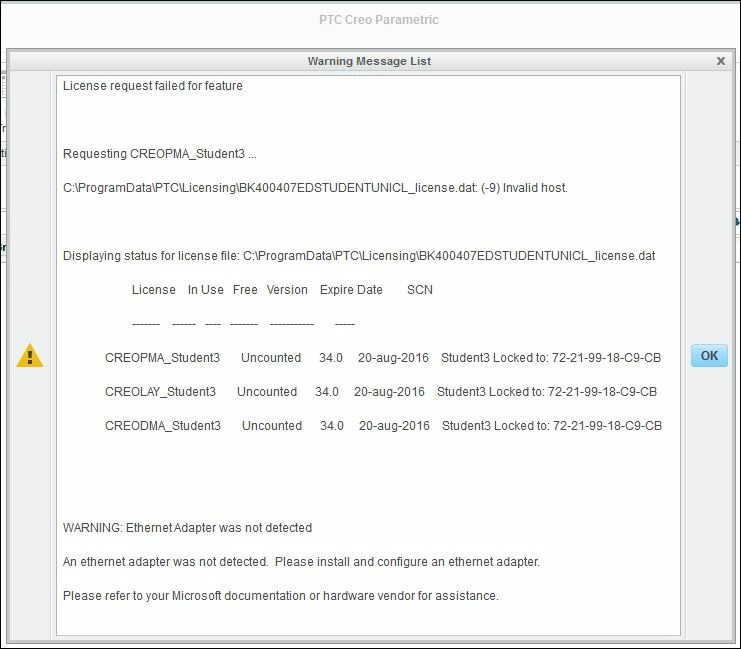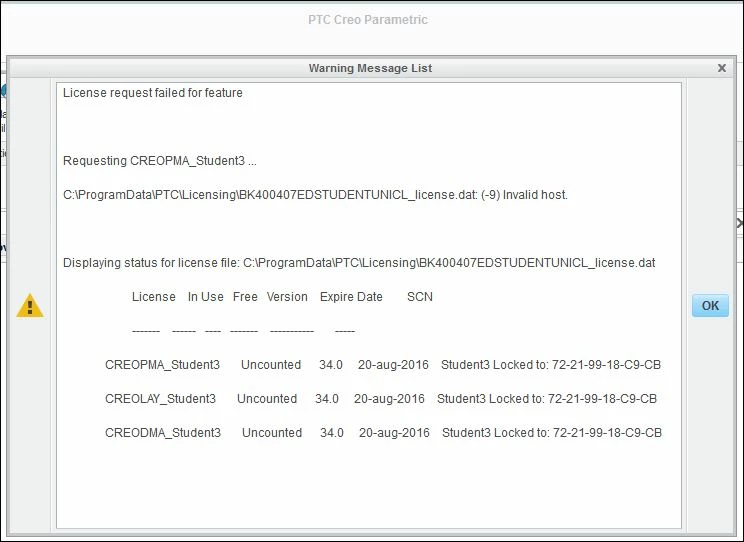 I then went to use the software a couple of days later and was denied access due to License Request Failure messages. Refer to attached screen shots (shown for PTC Creo Parametric, but also typical for Simulate, Direct and Layout applications)...