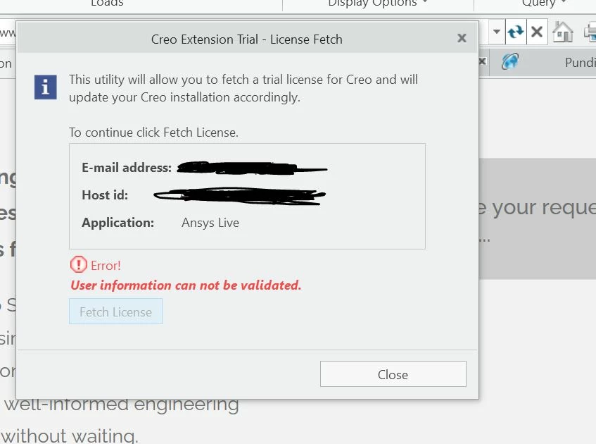 I am trying to install the trial for Creo 8 Simulate on my Student edition, as I want to run CFD. When I click the trial link, I am brought to a page, and I log in with my correct email address and remaining details. When I do so, I am prompted to a new screen, and click fetch license, but I keep receiving the error - "user information cannot be validated". How can I solve this issue?