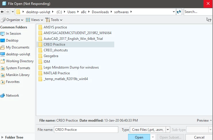 Nneelbasak081-VisitorForum|Forum|5 years agoMay 5, 2020QuestionCREO Parametric 6.0 (Student Version) continuously goes into 'Not Responding' state while openingForum|Forum|5 years agoMay 5, 20201 reply2326 viewsWhenever I try to Open an existing file or try to create a new part or assembly by clicking the 'New' or 'Open' tab on the menubar of CREO Parametric 6.0 Student version. It goes into not responding state Here is a screenshot: My PC specs are: Windows 10, i7-4th Gen, NVIDIA GeForce 840M, 8GB RAM,1 TB HDD. Please help me out in solving this issue, the situation is quite urgent. Thank youCreo Student Edition