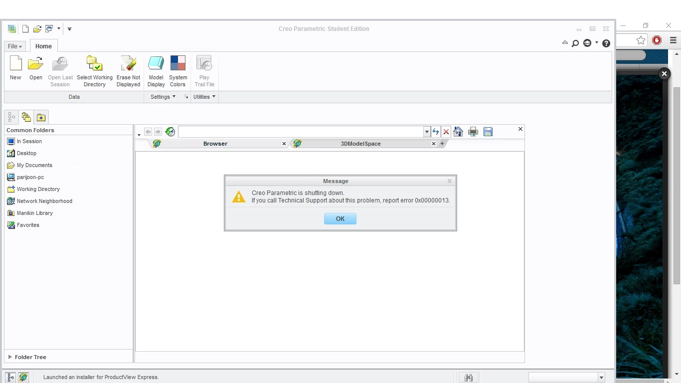 Ssshokouhi1-VisitorForum|Forum|10 years agoJanuary 4, 2016Questionerorr no.jpgForum|Forum|10 years agoJanuary 4, 20160 replies1075 views helloAfter installation of Creo 2.0 Student Edition, the application failed to open and I got the following error message: shutting down because.... could not the run Quality Agent which is required in this edition,,, error 0x00000013
