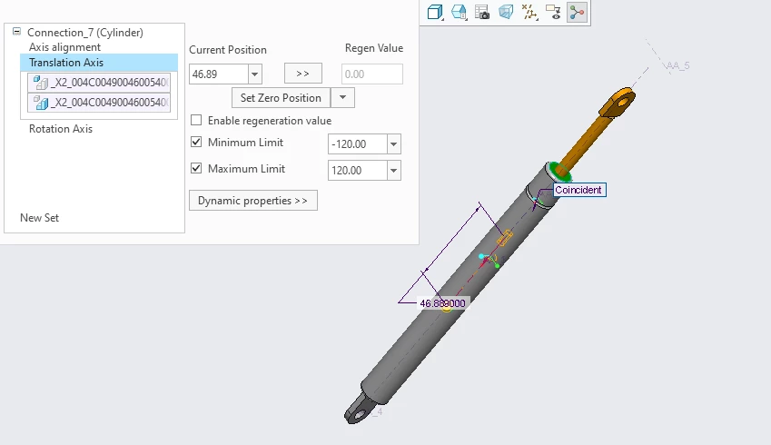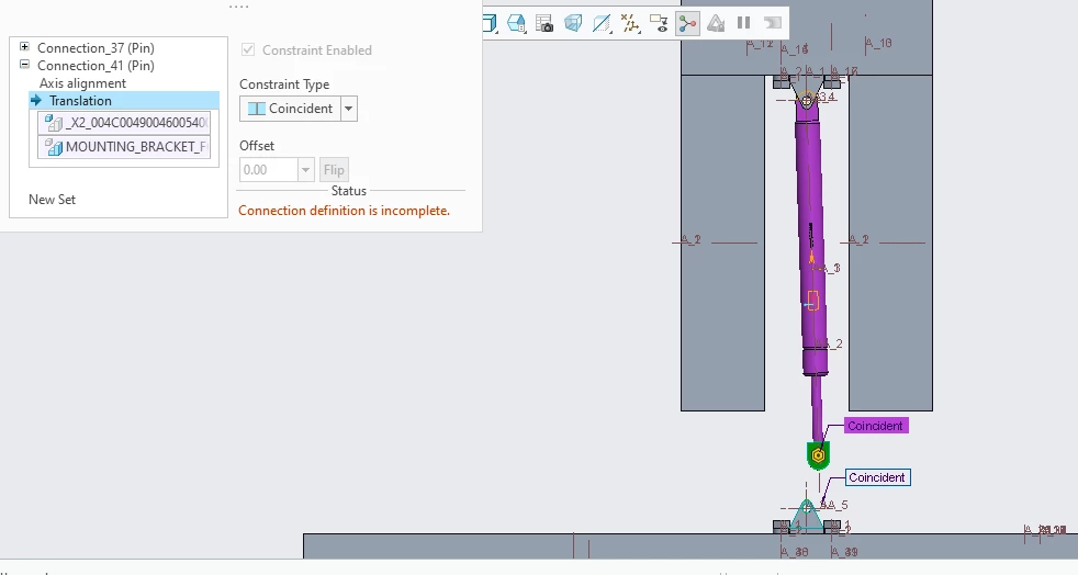 I am unable to constraint gas spring on both sides. At the upper side the pin type constraint is applying correctly. However, at the below part the pin constraint is not being applied. I have assembled the gas spring with cylinder type constraint. Any suggestions?
