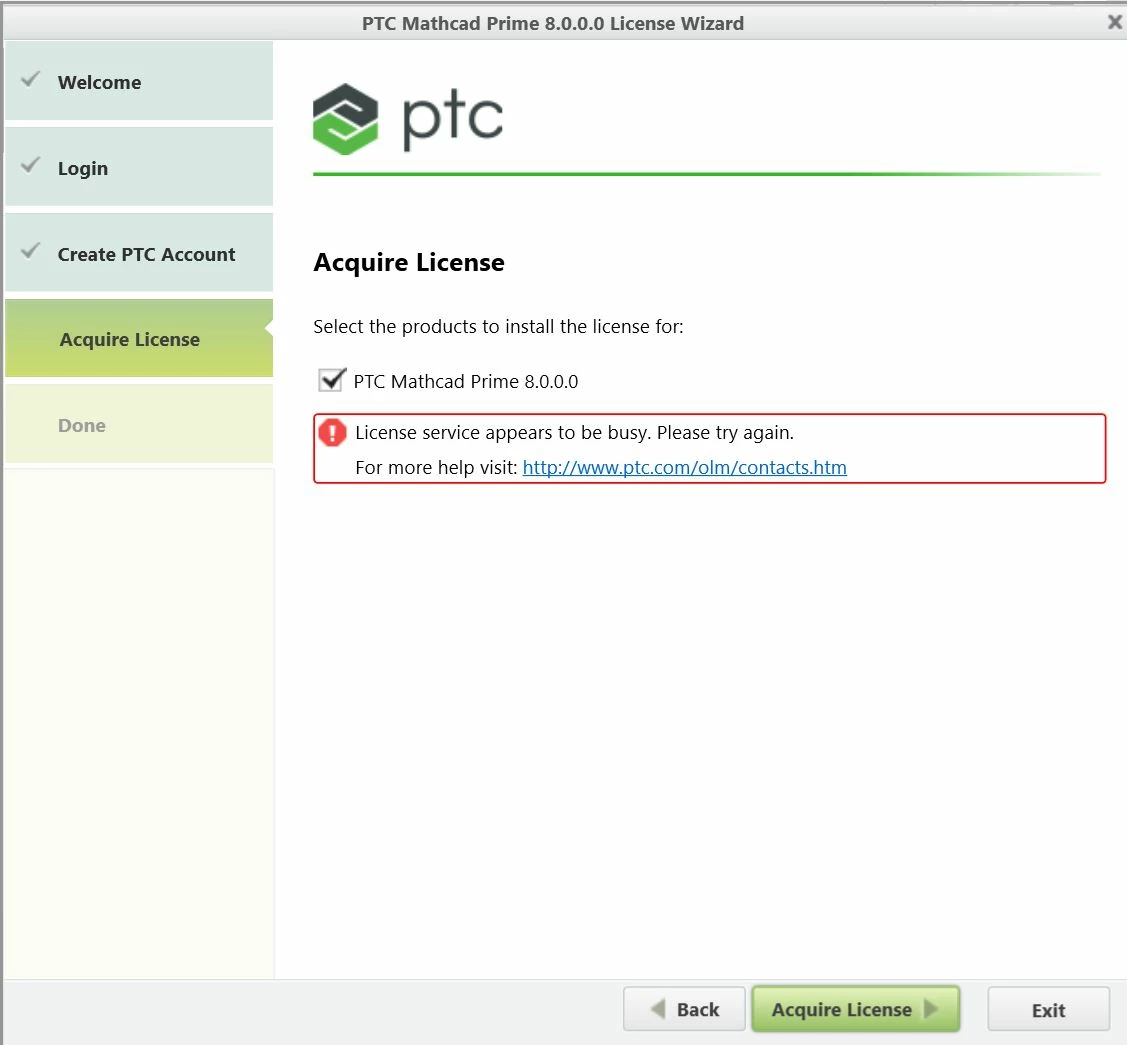 Hi! I do not manage to download PTC Mathcad Prime 8.0.0.0. During the installation process, when I click on "Acquire License", a warning message comes up, saying "License service appears to be busy. Please try again." I have "tried again" a couple of times without success, so I am wondering what to do to make the installation work?