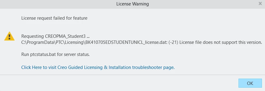 I have a fresh installation of CREO 11.0 with a free university license, every time I open the CREOParametric software I get the following error, and when I click OK the program crashes: