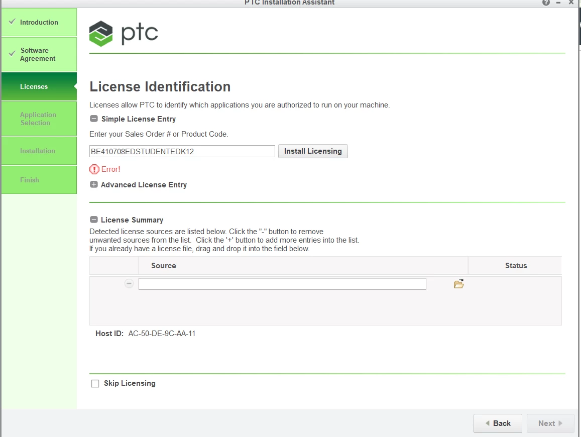 Please contact academicsupport@ptc.com. You need to send them the Host ID (Mac address of the ethernet) and also the product code used. I hope they will send you valid license file.