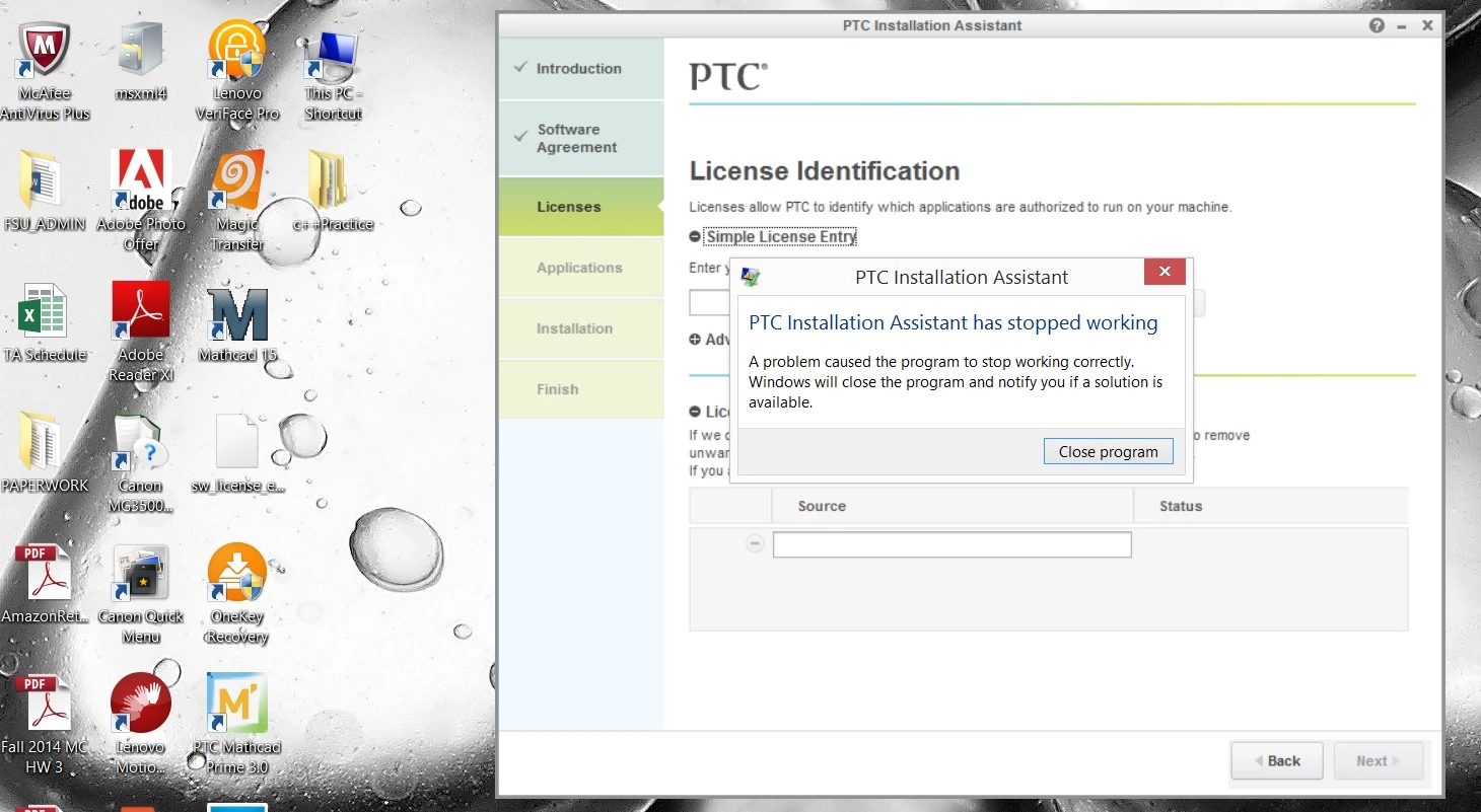 I have been trying to install the student version of CREO 2.0 and when I try to enter the product key, a window pops up and says "PTC Installation Assistant has stopped working" and no explanation as to why. I have attached a jpeg of a screen shot. I've submitted support requests and have heard nothing. What's going on?