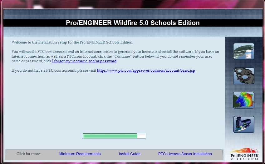 I've been trying to install schools edition of Pro/E 5 64bit and Pro/E 4 for windows 7 64bit. The installation hangs as shown in the attachment. I've tried to run the setup as administrator, with/without windows recommended settings and antivirus software turned on/off but the outcome is the same. Can you please help me with this issue.