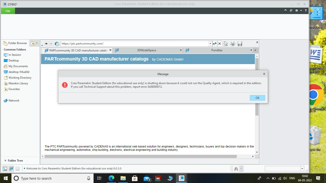 AAR_102992791-VisitorForum|Forum|3 years agoMay 4, 2022QuestionPTC CREO STUDENT VERSIONForum|Forum|3 years agoMay 4, 20221 reply1219 viewsI NEED OPEN PTC CREO STUDENT VERSION APPLICATION. BUT ITS NOT RUNNING (QUALITY AGENT) (error 0x06000012) SO KINDLY PLEASE SUPPORT OPENCreo Student Edition