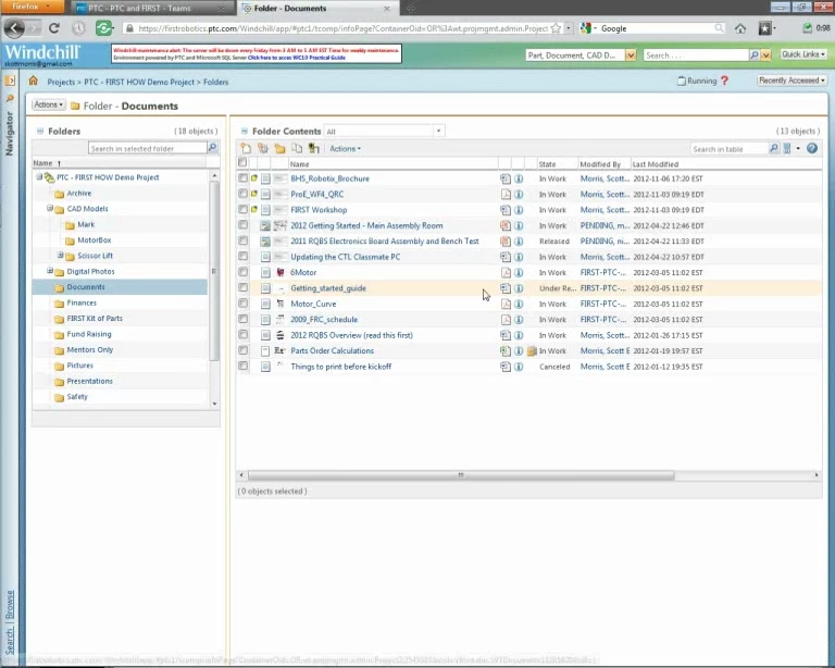 In this session of the ROBOTALK webcast series, we cover all the basic features and capabilites of Windchill for FIRST teams. This includes working with online folders and documents, viewing online content with Creo View and getting information and understanding the status of online content in Windchill.