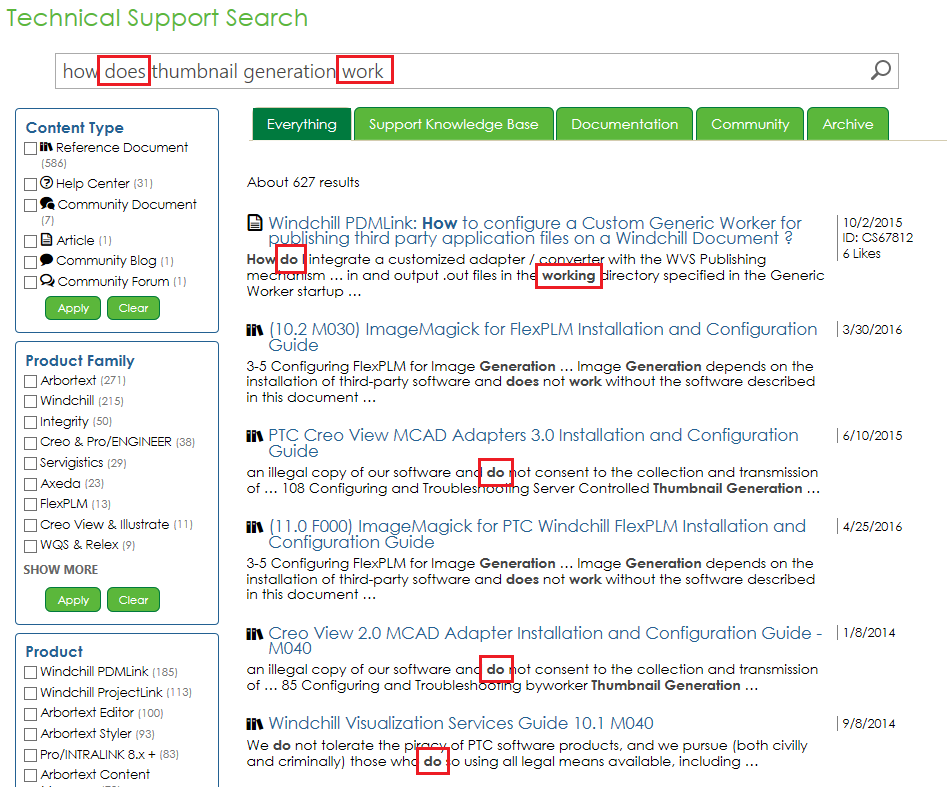 The knowledge base search automatically highlights words in the search results that match the search term. This is good. It also seems to be highlighting partial word matches. This is not good (in my opinion). In the example below, "do" and "working" should not be highlighted. Neither of these are search terms.