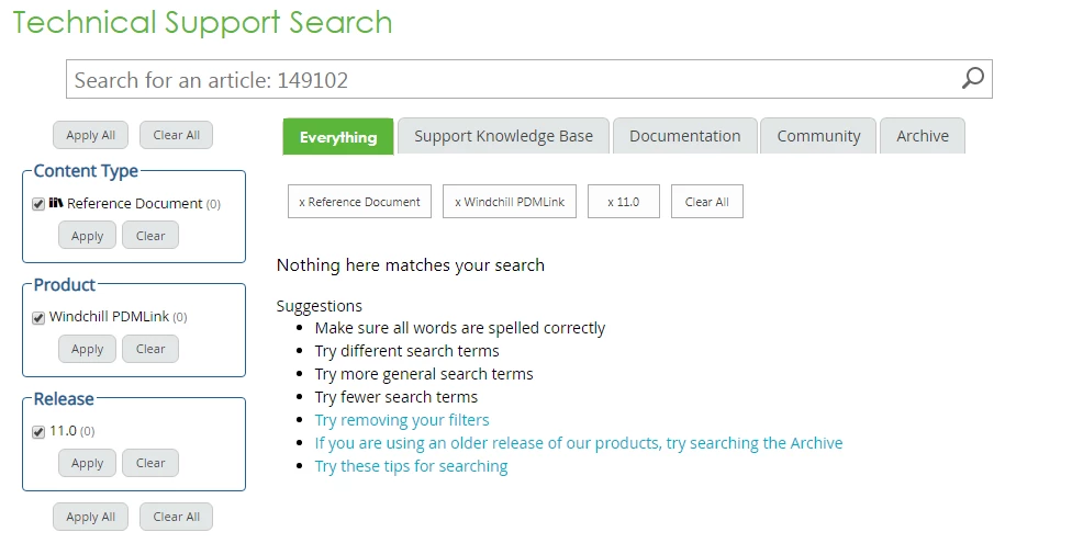 IInvisigoth1-VisitorForum|Forum|6 years agoJuly 3, 2019QuestionPTC Documentation searches are not finding any content "Nothing here matches your search"Forum|Forum|6 years agoJuly 3, 20191 reply3573 viewsOutage? Maintenance? I tried two browsers and cleared my browser history. eSupport PortalKnowledge Base and Search