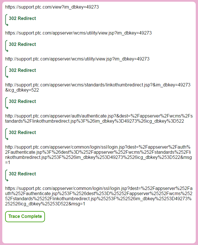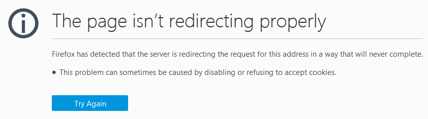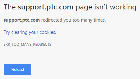 After browsing, the error "The support.ptc.com page isn't working support.ptc.com redirected you too many times. Try clearing your cookies. ERR_TOO_MANY_REDIRECTS" may appear.
