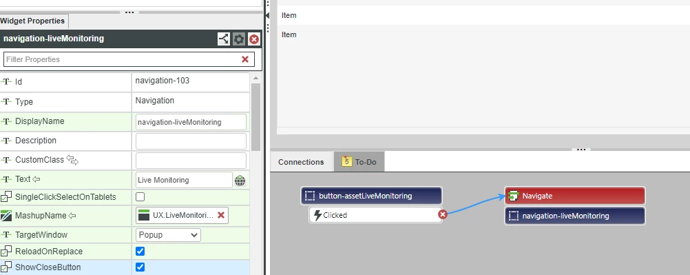 I have a simple requirement to navigate to one of my menu items by using the data from the selectedRow in my grid widget. The requirement is to navigate to the Live Monitoring menu item on a new tab but when I select the targetWindow field to be either New or Replace the screen always go to the menu item Overview. This should the most simple of bindings but it only navigates to the correct place when i configure the targetWindow as popup, modal popup or full screen. Please help!