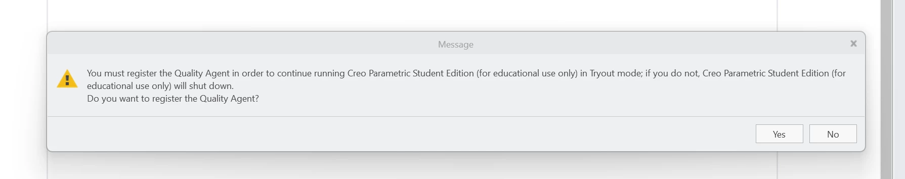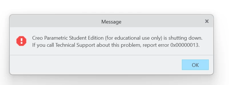 Instead, now every time I open Creo it says that I must register the Quality Agent for Creo to keep running and when I allow it to register it it says that Creo is shutting down under code 0x00000013.